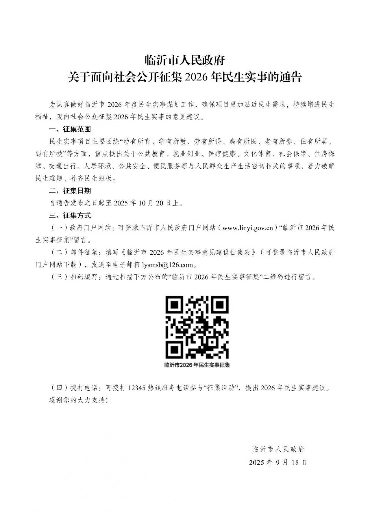 临沂市人民政府 关于面向社会公开征集2026年民生实事的通告